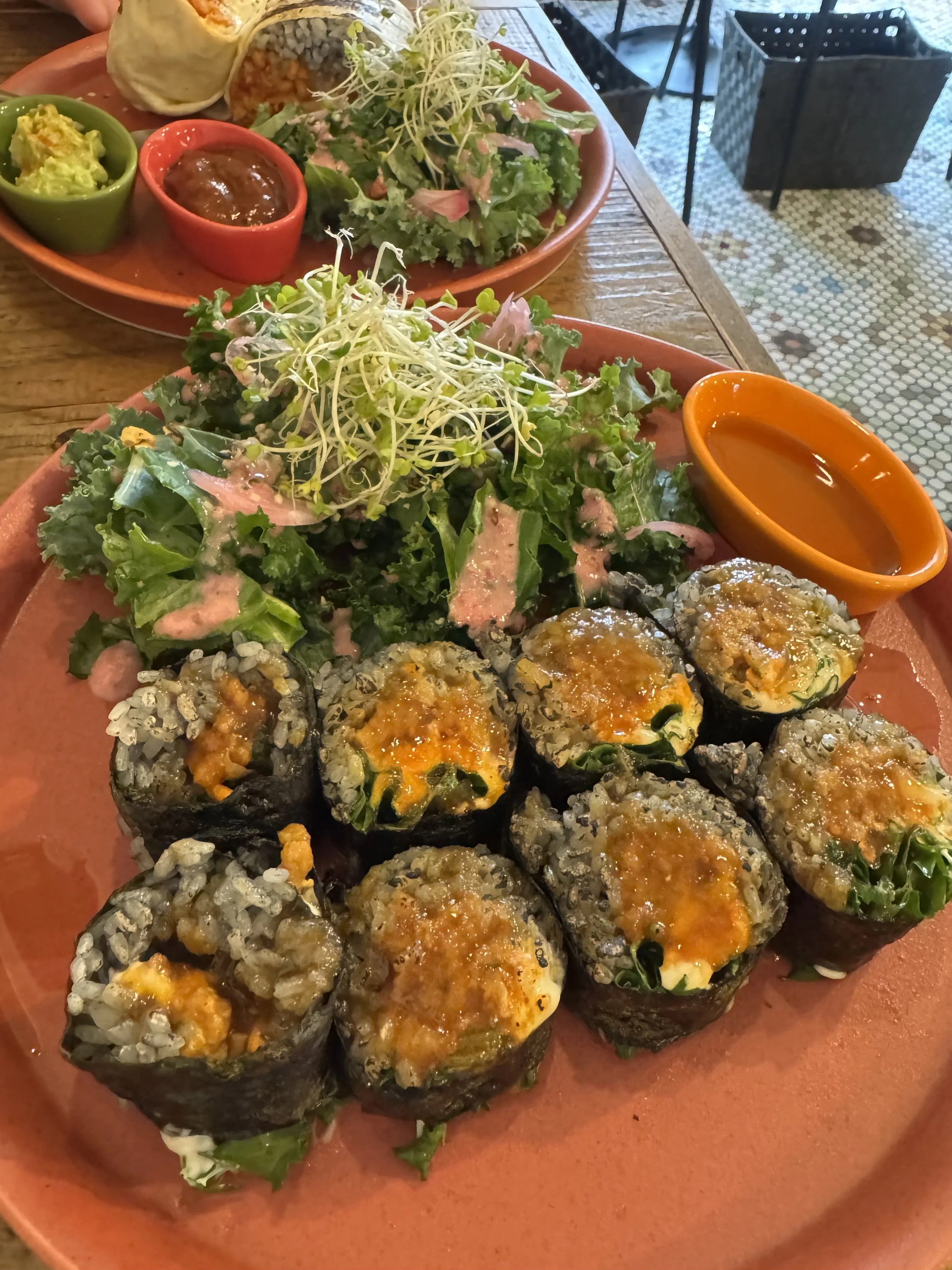 Earthie favorites: yakiniku style grilled sushi, mexican burrito, and kale salad